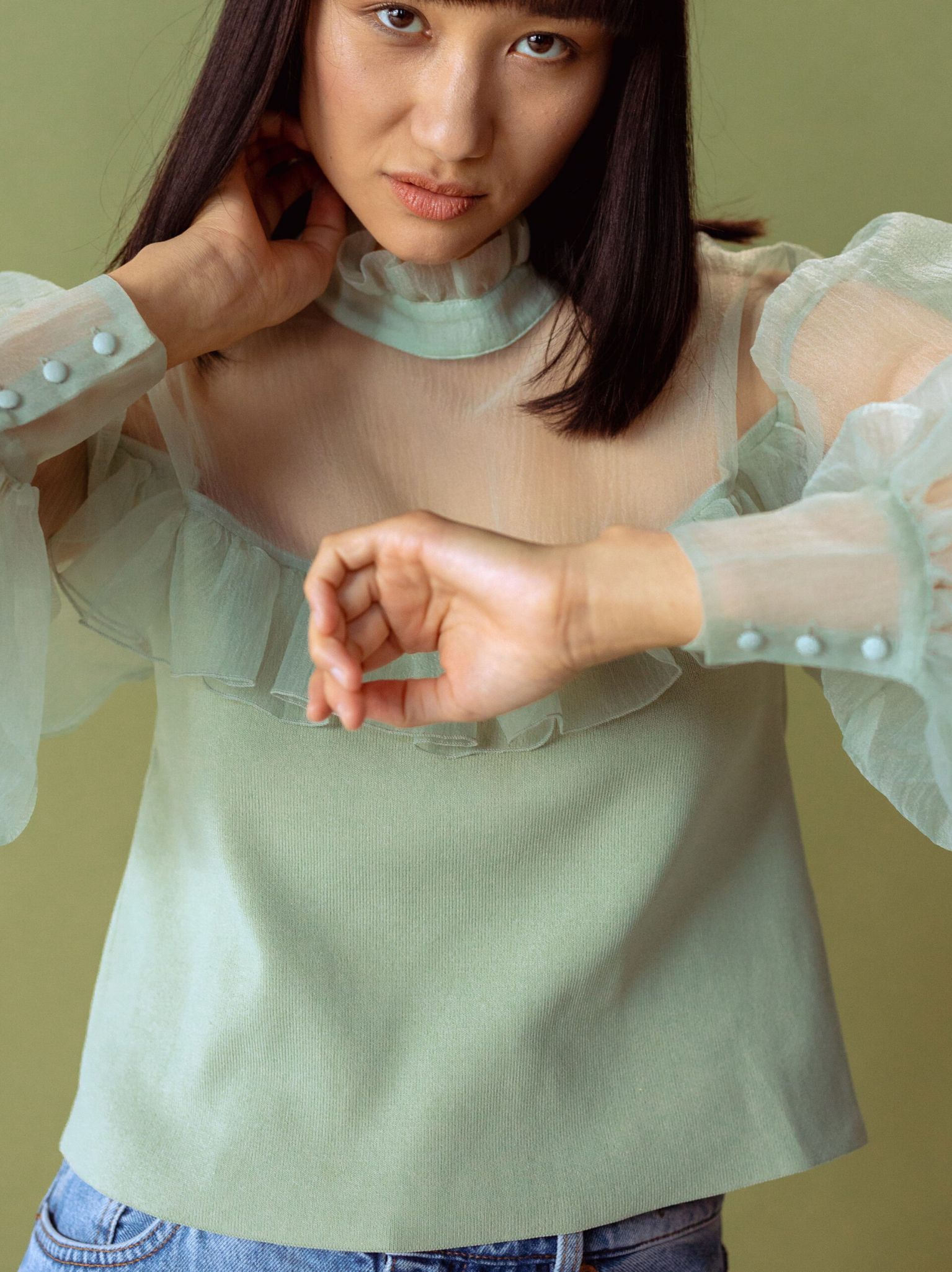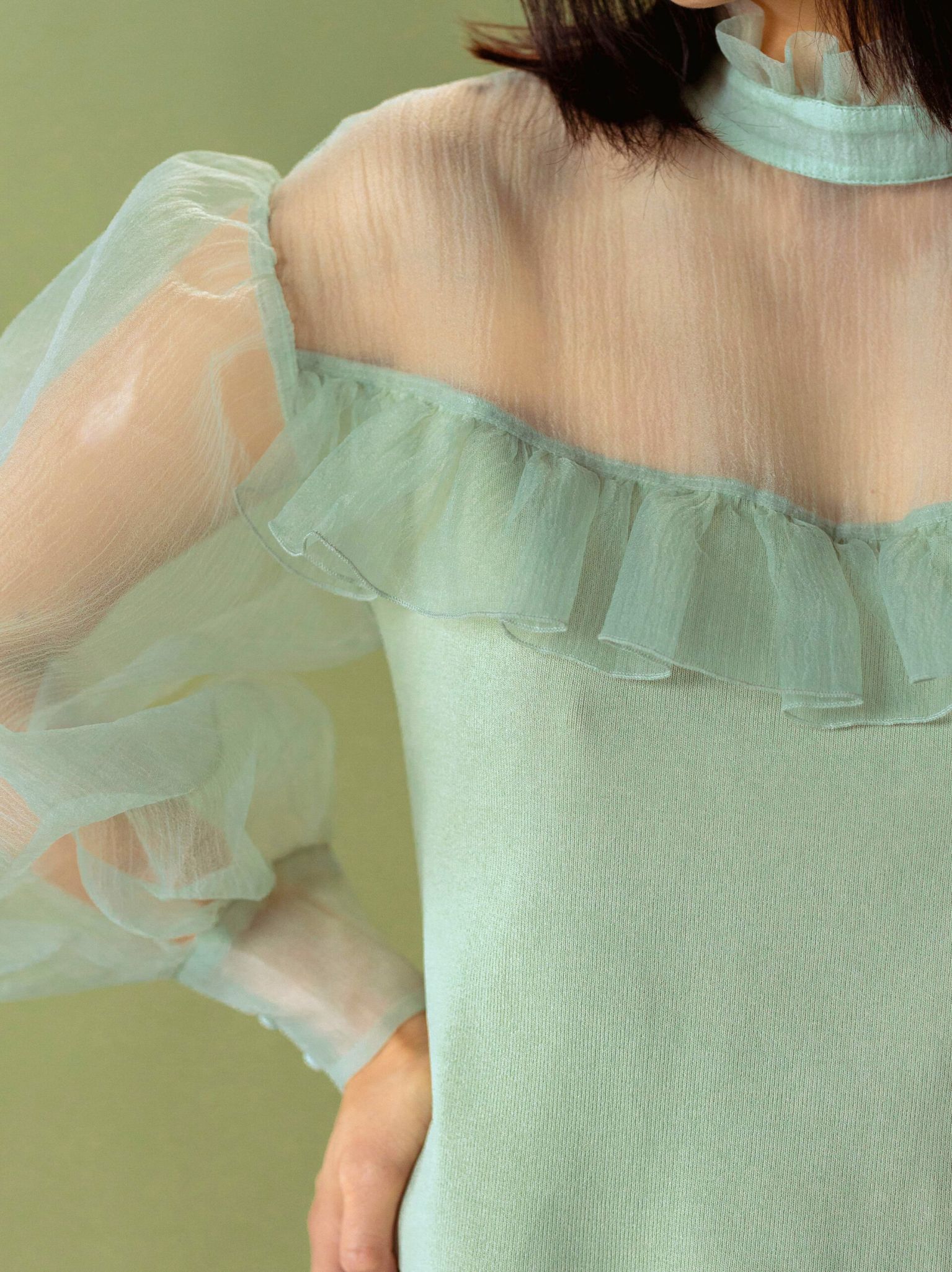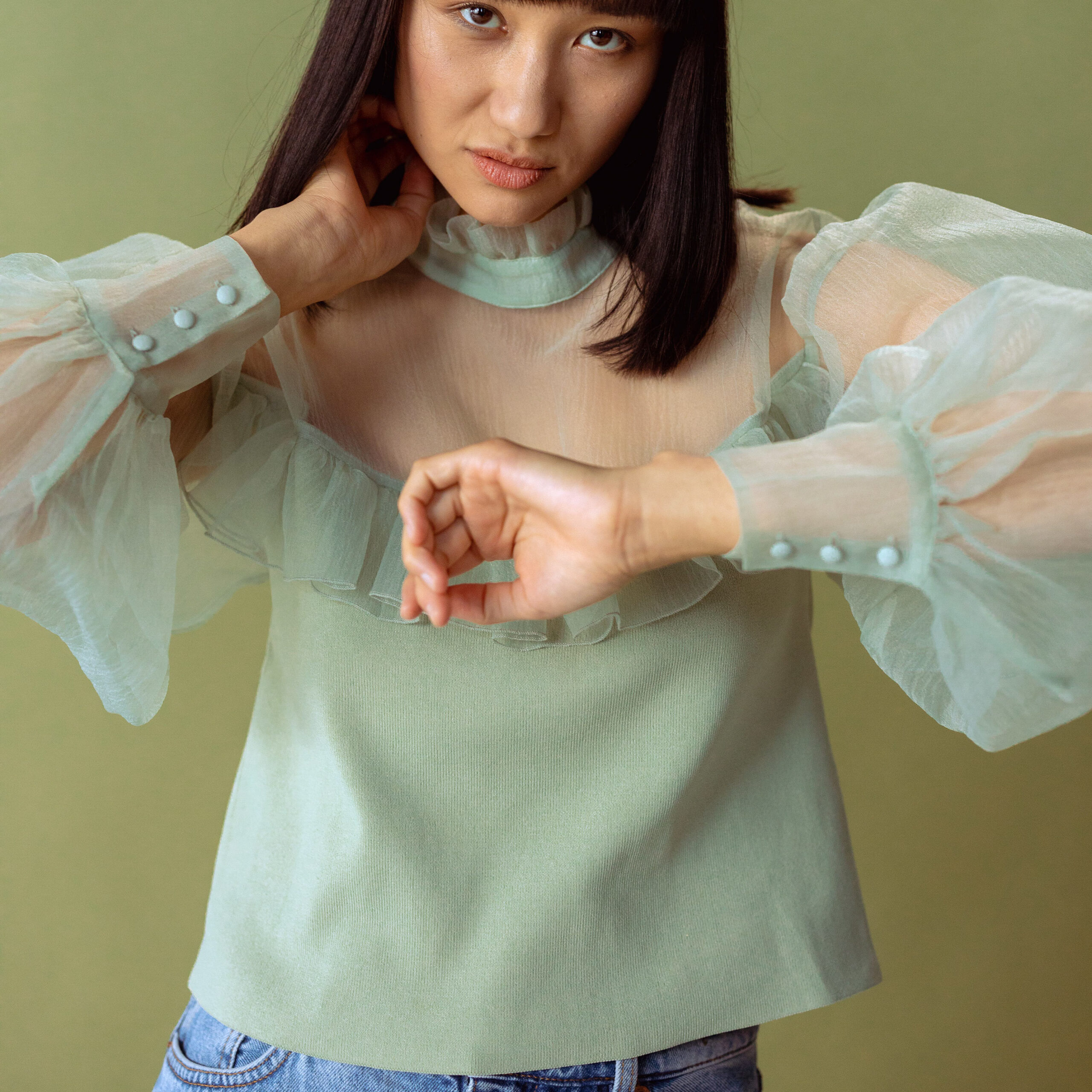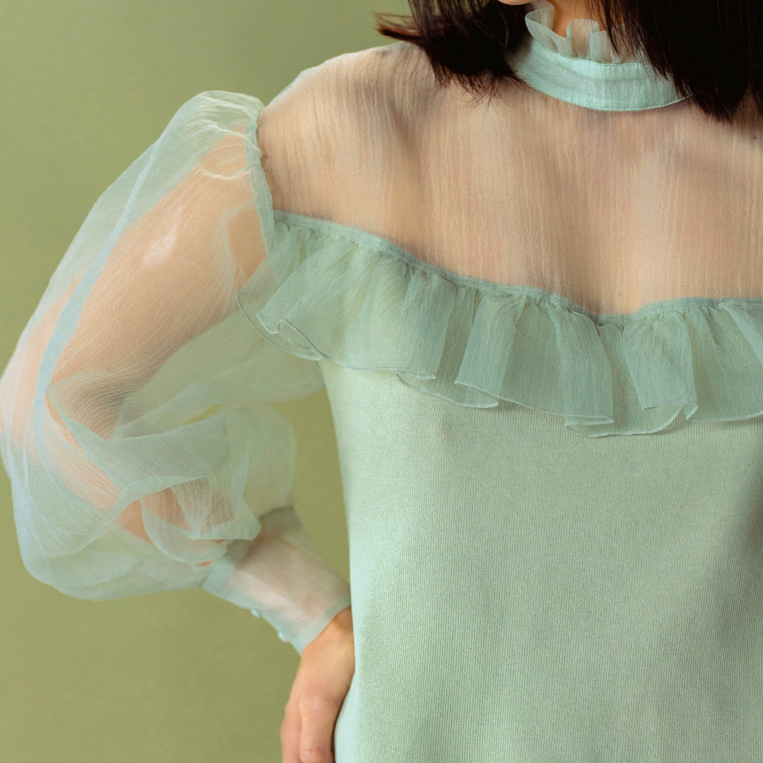 Ruffled Blouse With Sheer Puff Sleeves